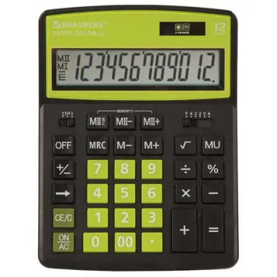 - Сколько стоит Калькулятор настольный BRAUBERG EXTRA COLOR-12-BKLG (206x155 мм), 12 разрядов, двойное питание, ЧЕРНО-САЛАТОВЫЙ, 250477?