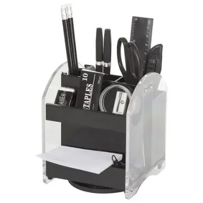 Вращающаяся подставка изготовлена из пластика и имеет 8 отделений. В наборе 15 предметов: - подставка, - ножницы, - канцелярский нож, - 2 шариковых ручки, - степлер №10, - скобы для степлера №10, - стирательная резинка, - линейка, - скрепки канцелярские, - 2 чернографитных карандаша, - бумага для заметок, - кнопки канцелярские, - точилка. Это товар эконом-сегмента, поэтому он отличается привлекательной ценой. Товар обладает базовым набором характеристик и простой упаковкой, при этом полностью с