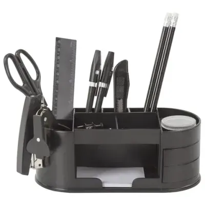 Подставка изготовлена из пластика и имеет 11 отделений. В наборе 16 предметов: - подставка, - ножницы, - канцелярский нож, - 2 шариковых ручки, - степлер №10, - скобы для степлера №10, - антистеплер, - стирательная резинка, - линейка, - скрепки канцелярские, - 2 чернографитных карандаша, - бумага для заметок, - кнопки канцелярские, - точилка. Это товар эконом-сегмента, поэтому он отличается привлекательной ценой. Товар обладает базовым набором характеристик и простой упаковкой, при этом полност