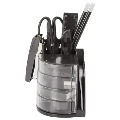 Компактная раскрывающаяся подставка изготовлена из пластика и имеет 6 отделений. В наборе 13 предметов: - подставка; - ножницы; - канцелярский нож; - шариковая ручка; - степлер №10; - скобы для степлера №10; - стирательная резинка; - линейка; - скрепки канцелярские; - 2 чернографитных карандаша; - бумага для заметок; - точилка. Это товар эконом-сегмента, поэтому он отличается привлекательной ценой. Товар обладает базовым набором характеристик и простой упаковкой, при этом полностью соответствуе