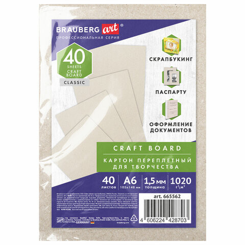 Картон переплетный, толщина 1,5 мм, А6 (105х148 мм), КОМПЛЕКТ 40 шт, BRAUBERG ART, 665562 по низкой цене оптом