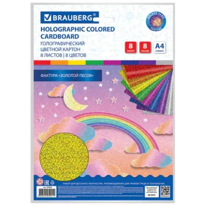 - Картон цветной А4 ГОЛОГРАФИЧЕСКИЙ, 8 листов 8 цветов, 230 г/м2, "ЗОЛОТОЙ ПЕСОК", BRAUBERG, 124755 — это продукция бренда BRAUBERG. В нашем магазине представлен широкий ассортимент товаров BRAUBERG.