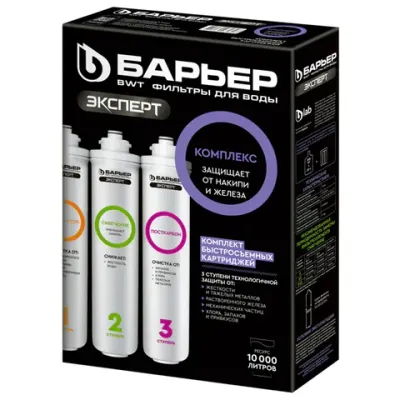 Комплект сменных картриджей БАРЬЕР "ЭКСПЕРТ Комплекс" – это мощное решение для домов и дач, где вода одновременно жёсткая и насыщена железом: она оставляет белый налёт в чайниках, рыжий осадок на посуде и придаёт напиткам неприятный металлический привкус.