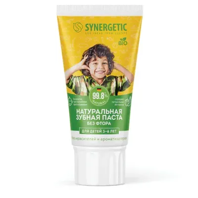 Натуральная зубная паста для детей от 3 до 6 лет SYNERGETIC со вкусом клубнички и банана – безопасная и эффективная паста без фтора, ароматизаторов и красителей.