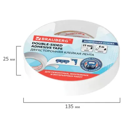 - Клейкая двухсторонняя лента 25 мм х 8 м, НА ВСПЕНЕННОЙ ОСНОВЕ, 1 мм, прочная, BRAUBERG, 600487 — это продукция бренда BRAUBERG. В нашем магазине представлен широкий ассортимент товаров BRAUBERG.