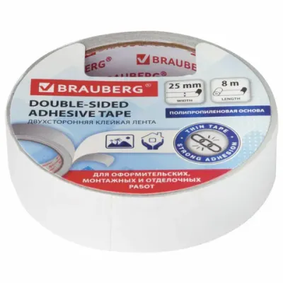 - Клейкая двухсторонняя лента 25 мм х 8 м, ПОЛИПРОПИЛЕНОВАЯ ОСНОВА, 90 микрон, BRAUBERG, 606425 — это продукция бренда BRAUBERG. В нашем магазине представлен широкий ассортимент товаров BRAUBERG.