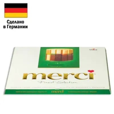 - Конфеты MERCI ассорти из шоколада с миндалем, 250 г, ГЕРМАНИЯ, 014457-20 — это продукция бренда MERCI. В нашем магазине представлен широкий ассортимент товаров MERCI.