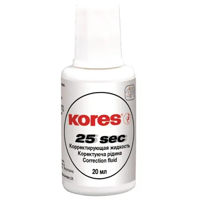 Корректирующая жидкость Kores на спиртовой основе применяется для корректировки всех видов чернил, рукописных и печатных текстов. Полностью закрашивает текст. Ложится ровным гладким слоем, создает непрозрачное покрытие. Имеет быстросохнущую основу. Во флаконе есть металлический шарик (перед использованием рекомендуется встряхивать). Вид кисточки — ворс. Объем флакона с корректирующей жидкостью составляет 20 мл.