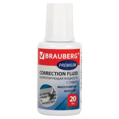 - Корректирующая жидкость BRAUBERG "Premium" быстросохнущая, 20 мл, с губчатым аппликатором, 224090 — это продукция бренда BRAUBERG. В нашем магазине представлен широкий ассортимент товаров BRAUBERG.