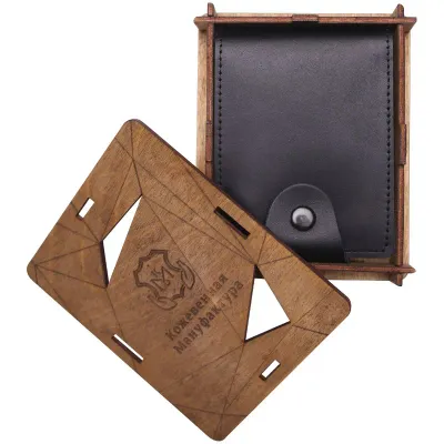 - Кошелек Кожевенная мануфактура, черный + светло-коричневый, с магнитной защитой, в деревянной упаковке — какой бренд?