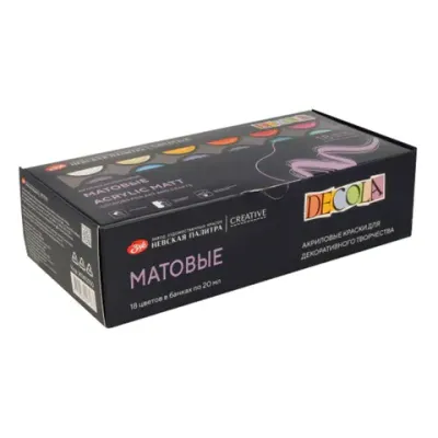 - Краски акриловые матовые "Декола", 18 цветов по 20 мл, в банках, Невская Палитра, 143412150 — это продукция бренда НЕВСКАЯ ПАЛИТРА. В нашем магазине представлен широкий ассортимент товаров НЕВСКАЯ ПАЛИТРА.