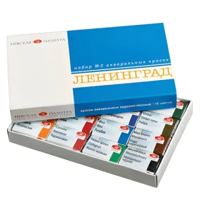 - Цена на Краски акварельные художественные "Ленинград-2", 16 цветов, кювета 2,5 мл, картонная коробка, Невская Палитра, 1941020 составляет 1 909,84 рублей. При оптовом заказе цена от 1 723,24 рублей.