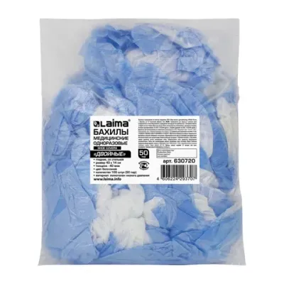 Бахилы КОМПЛЕКТ 100 штук (50 пар), ДВОЙНЫЕ (со стелькой), 40х14 см, 40 мкм, 4 г, ПНД, LAIMA, 630720