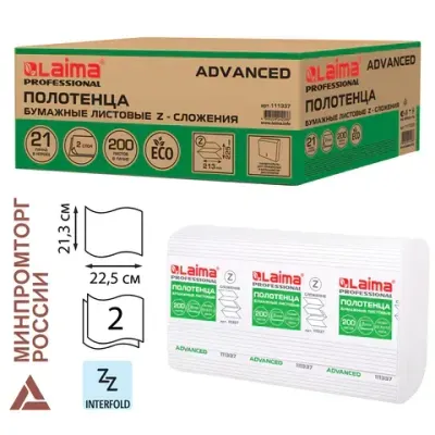 - Полотенца бумажные 200 шт., LAIMA (H2) ADVANCED, 2-слойные, белые, КОМПЛЕКТ 21 пачка, 22,5х21,3, Z-сложение, 111337 — это продукция бренда LAIMA. В нашем магазине представлен широкий ассортимент товаров LAIMA.