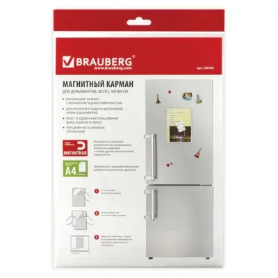 Магнитный карман для документов, фото, записок, формат А4, прозрачный, BRAUBERG, 236792