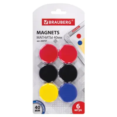 Магниты БОЛЬШОГО ДИАМЕТРА, 40 мм, КОМПЛЕКТ 6 штук, цвет АССОРТИ, в блистере, BRAUBERG, 230757