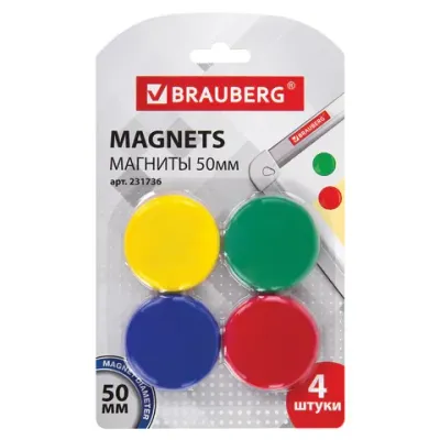 Магниты БОЛЬШОГО ДИАМЕТРА, 50 мм, КОМПЛЕКТ 4 штуки, цвет АССОРТИ, в блистере, BRAUBERG, 231736