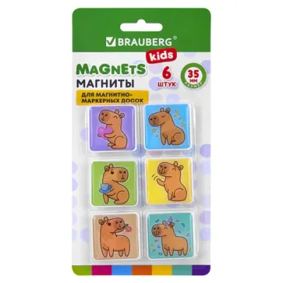 Магниты квадратные стеклянные 35 мм для досок магнитно-маркерных, НАБОР 6 шт., "Капибара", BRAUBERG KIDS, блистер, 272513