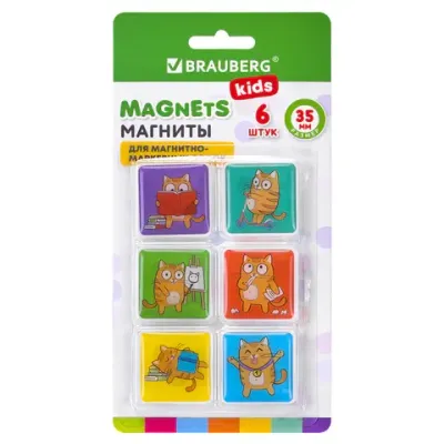 Магниты квадратные стеклянные 35 мм для досок магнитно-маркерных, НАБОР 6 шт., "Кот-энтузиаст" BRAUBERG KIDS, блистер, 272514