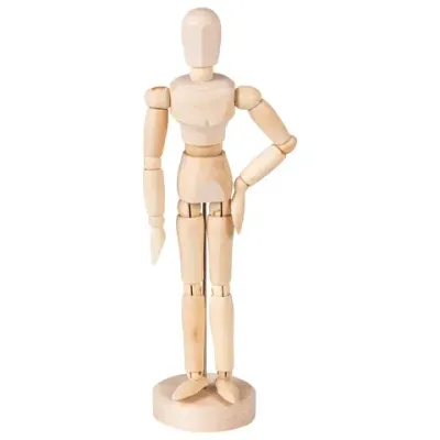 Каждая деталь в точности выточена под определенную часть тела человека, все они скреплены между собой в тех местах, где сгибаются суставы. Это позволяет в точности передать то или иное действие, создать основу рисунка, чтобы в дальнейшем проработать картину во всех подробностях. Манекен мужского пола изготовлен из натурального дерева. Детали между собой скрепляются металлическими болтиками и пружинками, что предоставляет возможность зафиксировать манекен в необходимом положении. Имеется круглая