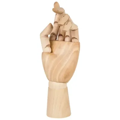 Манекен изготовлен из дерева, представляет из себя модель женской левой руки, способной сгибаться в местах сгиба фаланг пальцев и в области запястья. Соединения предоставляют возможность зафиксировать модель в необходимом положении. Манекен является отличной альтернативой живой натуре, поскольку не может случайно это положение поменять. Высота - 25 см. Упакован в белую коробку.