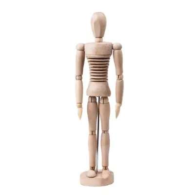 Отдельные части манекена соединяются шарнирами в тех местах, где сгибаются суставы человека. Это предоставляет возможность зафиксировать манекен в необходимом положении и в точности передать то или иное действие, создать основу рисунка, чтобы в дальнейшем проработать картину во всех подробностях. Манекен мужского пола изготовлен из натурального дерева. Имеется круглая подставка с металлической опорой. Высота - 30 см. Вес - 0,308 кг. Художественные манекены пригодятся школьникам, студентам, учас