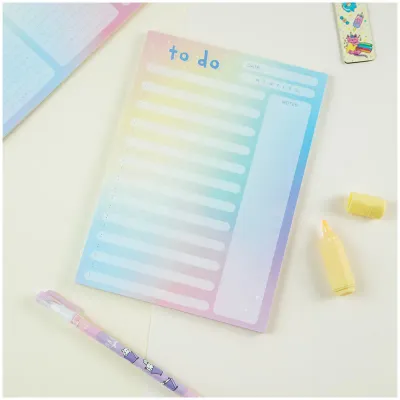 Блок бумаги для записей на склейке (To Do list) MESHU Candy color поможет фиксировать важную информацию и интересные идеи. Плотность офсетной бумаги составляет 80 г/м2. Размер листа в блоке для заметок – 148 × 210 мм, формат А5, 50 листов в упаковке.