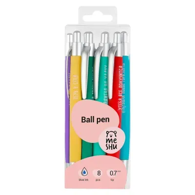 - Набор шариковых автоматических ручек MESHU "Motivation" 8шт., синие, 0,7мм, корпус ассорти, ПВХ бокс с европодвесом — это продукция бренда MESHU. В нашем магазине представлен широкий ассортимент товаров MESHU.