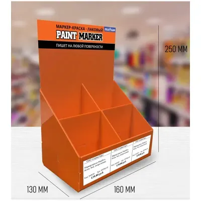 Картонный дисплей MunHwa Paint Marker для оформления полочного пространства и прикассовой зоны в магазинах хобби и творчества, а также для привлечения внимания. Оснащен наглядными обучающими подсказками способов применения и преимуществами продукта.