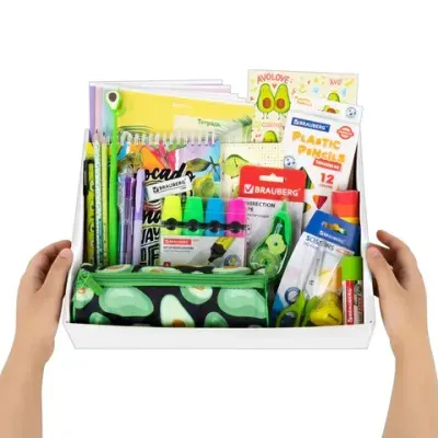Большой набор канцелярских принадлежностей BRAUBERG "AVOCADO" в подарочной упаковке скомпонован из самых необходимых предметов одной тематики, за счет чего смотрится ярко и и интересно.