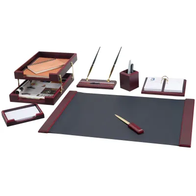 Набор состоит из 8 универсальных предметов: - коврик для письма (размер – 60х42 см) - два лотка (для бумаг формата А4), которые можно соединить в один двойной; - подставка для ручек (2 шариковые ручки в комплекте); - стакан-подставка для письменных принадлежностей и канцелярских мелочей; - нож для вскрытия конвертов; - подставка под листы для записей (листы в комплекте); - подставка для перекидного календаря. Все предметы изготовлены из дерева в красном цвете с золотистой фурнитурой. Набор упак