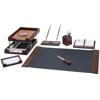 Набор состоит из 8 универсальных предметов: - коврик для письма (размер – 60х42 см) - два лотка (для бумаг формата А4), которые можно соединить в один двойной; - подставка для ручек (2 шариковые ручки в комплекте); - стакан-подставка для письменных принадлежностей и канцелярских мелочей; - нож для вскрытия конвертов; - подставка под листы для записей (листы в комплекте); - подставка для перекидного календаря. Все предметы изготовлены из дерева цвета "орех" с золотистой фурнитурой. Набор упакова