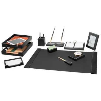 Набор состоит из 11 универсальных предметов: - коврик для письма (размер – 60х42 см) - два лотка (для бумаг формата А4), которые можно соединить в один двойной; - подставка для ручек (2 шариковые ручки в комплекте); - стакан-подставка для письменных принадлежностей и канцелярских мелочей; - рамка для фото; - часы; - нож для вскрытия конвертов; - подставка под листы для записей; - подставка под визитки; - подставка для перекидного календаря. Все предметы изготовлены из дерева черного цвета с зол