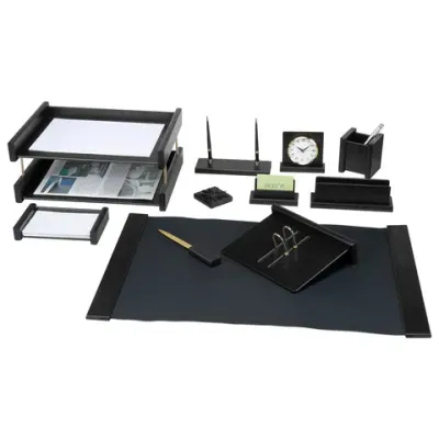 Набор состоит из 12 универсальных предметов: - коврик для письма (размер – 66х43 см) - два лотка (для бумаг формата А4), которые можно соединить в один двойной; - подставка для ручек (2 шариковые ручки в комплекте); - стакан-подставка для письменных принадлежностей и канцелярских мелочей; - рамка для фото; - часы; - нож для вскрытия конвертов; - подставка под листы для записей (листы в комплекте); - подставка под визитки; - магнитная скрепочница; - подставка для перекидного календаря. Все предм