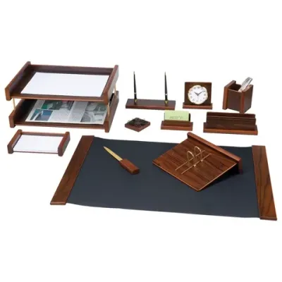 Набор состоит из 12 универсальных предметов: - коврик для письма (размер – 66х43 см) - два лотка (для бумаг формата А4), которые можно соединить в один двойной; - подставка для ручек (2 шариковые ручки в комплекте); - стакан-подставка для письменных принадлежностей и канцелярских мелочей; - рамка для фото; - часы; - нож для вскрытия конвертов; - подставка под листы для записей (листы в комплекте); - подставка под визитки; - магнитная скрепочница; - подставка для перекидного календаря. Все предм