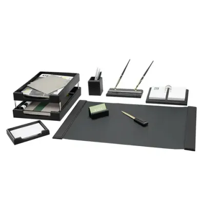 В набор входит 9 универсальных предметов: - коврик для письма (размер – 60х42 см) - два лотка (для бумаг формата А4), которые можно соединить в один двойной; - подставка для ручек (2 шариковые ручки в комплекте); - стакан-подставка для письменных принадлежностей и канцелярских мелочей; - нож для вскрытия конвертов; - подставка под листы для записей (листы в комплекте); - подставка под визитки; - подставка для перекидного календаря. Все предметы изготовлены из дерева черного цвета с золотистой ф