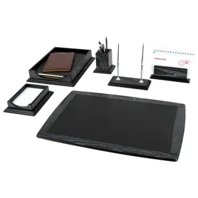 Набор состоит из 6 предметов: - лоток для бумаг формата А4; - коврик для письма (размер 59х43,5 см); - подставка для ручек (2 шариковые ручки с синими чернилами в комплекте); - стакан-подставка для письменных принадлежностей; - подставка для бумажного блока; - подставка для писем. Все предметы изготовлены из дерева комбинированного цвета "чёрный дуб". Набор дополнительно упакован в защитную коробку для сохранности в процессе транспортировки. Представленный комплект относится к премиально