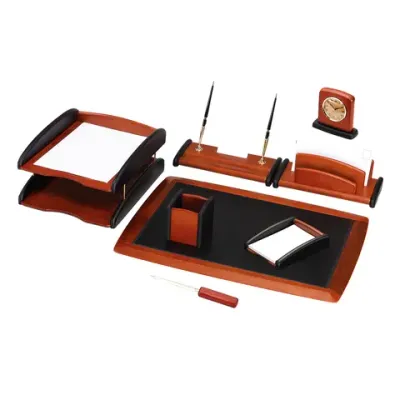 Набор состоит из 9 предметов: - два лотка (для бумаг формата А4), которые можно соединить в один двойной; - коврик для письма (размер 59х43,5 см); - подставка для ручек (2 шариковые ручки с синими чернилами в комплекте) со специальным отверстием под визитки; - стакан-подставка для письменных принадлежностей; - подставка для бумажного блока; - часы с кварцевым механизмом; - подставка для писем; - нож для вскрытия конвертов. Все предметы изготовлены из дерева комбинированного цвета "палисандр