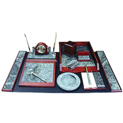 Изготовлен из зеленого мрамора с отделкой из красного дерева и золотистой фурнитурой. Состоит из 7 предметов: - жесткий коврик для письма с деревянной рамкой, покрытие из натуральной кожи; - лоток для бумаг; - подставка для бумажного блока, размером 15,2x16,4x6,9 см; - 2 ручки в комплекте; - подставка с настольными часами; - подставка для визиток; - подставка для перекидного календаря; Фирменная подарочная коробка станет приятным дополнением к основному презенту.