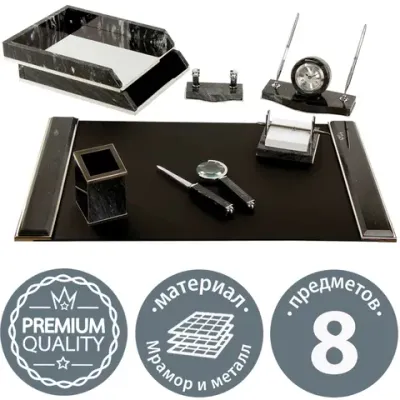 Изготовлен из мрамора черного цвета с серебристой фурнитурой. Состоит из 8 предметов: - коврик для письма с жестким основанием, покрытый натуральной кожей, размером 46х74 см; - подставка для визиток; - подставка для ручек с часами (2 шариковые ручки в комплекте); - подставка для бумажного блока, размер которой - 13x13x8,3 см; - стакан для карандашей; - двойной лоток для бумаг; - нож для открывания конвертов; - лупа. Фирменная подарочная коробка станет приятным дополнением к основному презенту