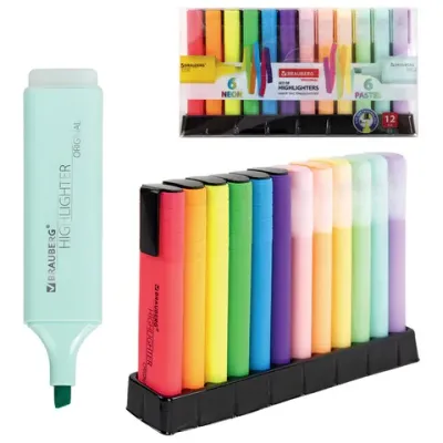 Набор текстовыделителей 12 ЦВЕТОВ на подставке, BRAUBERG "ORIGINAL NEON", линия письма 1-5 мм, 152217