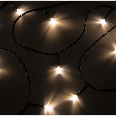 Данная гирлянда имеет длину 15 м, теплый белый цвет свечения светодиодов.