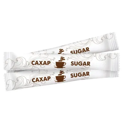 Рафинированный быстрорастворимый сахарный песок в индивидуальной трехшовной упаковке. Сахар изготовлен по ГОСТу 22—94.