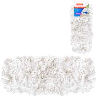Насадка (МОП) изготовлена из хлопка с длинным ворсом. Хлопок дает высокую гигроскопичность насадке, при сухой уборке насадка хорошо убирает пыль, не позволяя ей разлетаться, а при влажной уборке отлично впитывает воду, не оставляя разводов на полу. Благодаря тому, что насадка изготовлена не из 100% хлопка, а с добавлением полиэстера - это дает ей высокую стойкость к истиранию, при этом она хорошо скользит по полу, собирает грязь, мелкий мусор, песок, шерсть домашних животных. Насадка может крепиться к держателю швабры при помощи карманов или ушей. Отжим насадки производится вручную.