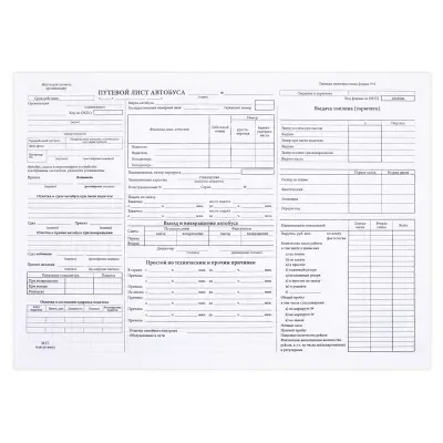 Бланк «Путевой лист автобуса» выполнен по утверждённой форме №6. Двусторонние бланки формата А4 изготовлены из офсетной бумаги и склеены в книгу по 100 листов. Упакованы в термоусадочную плёнку.