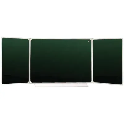Трехсекционная магнитно-меловая доска с пятью рабочими поверхностями предназначена для применения в учебных заведениях. Зелёное лаковое покрытие предназначено для письма мелом. Металлическая поверхность позволяет размещать материал с информацией при помощи магнитов. Состоит из центральной секции шириной 150 см и двух боковых секций шириной 75 см каждая. Высота — 100 см