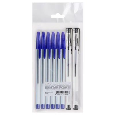 Набор шариковых и гелевых ручек 8 штук. Товар поставляется комплектом 6 шариковых ручек и 2 гелевые. В состав набора входят шариковые неавтоматические ручки с синими чернилами. Диаметр пишущего узла 0,7 мм. Толщина линии - 0,5 мм. Корпус ручки - прозрачный пластик. Форма корпуса-шестигранная.