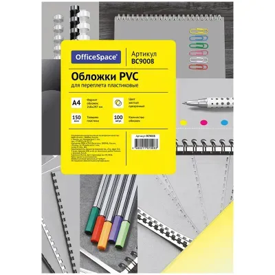 - Основные характеристики Обложка А4 OfficeSpace "PVC" 150мкм, прозрачный желтый пластик, 100л.: Материал: Пластик, Цвет: Желтый прозрачный, Тип: Обложка для переплета, Формат: А4. Полный список характеристик доступен на странице товара.