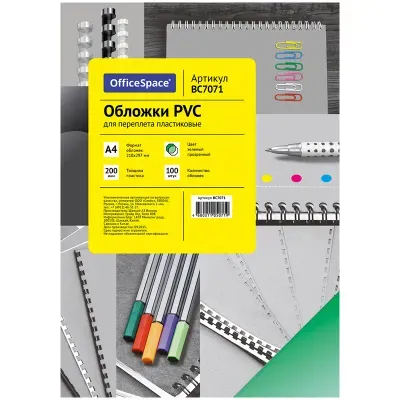 - Основные характеристики Обложка А4 OfficeSpace "PVC" 200мкм, прозрачный зеленый пластик, 100л.: Материал: Пластик, Цвет: Прозрачный зеленый, Тип: Обложка для переплета, Формат: А4. Полный список характеристик доступен на странице товара.