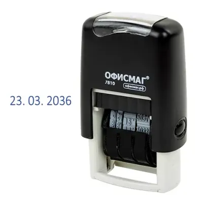 - Основные характеристики Датер-мини ОФИСМАГ, месяц цифрами, оттиск 22х4 мм, "Printer 7810 BANK", 271926: Цвет оттиска даты: синий, Материал корпуса: пластик, Цвет корпуса: черный, Цвет оттиска текста: Нет данных. Полный список характеристик доступен на странице товара.